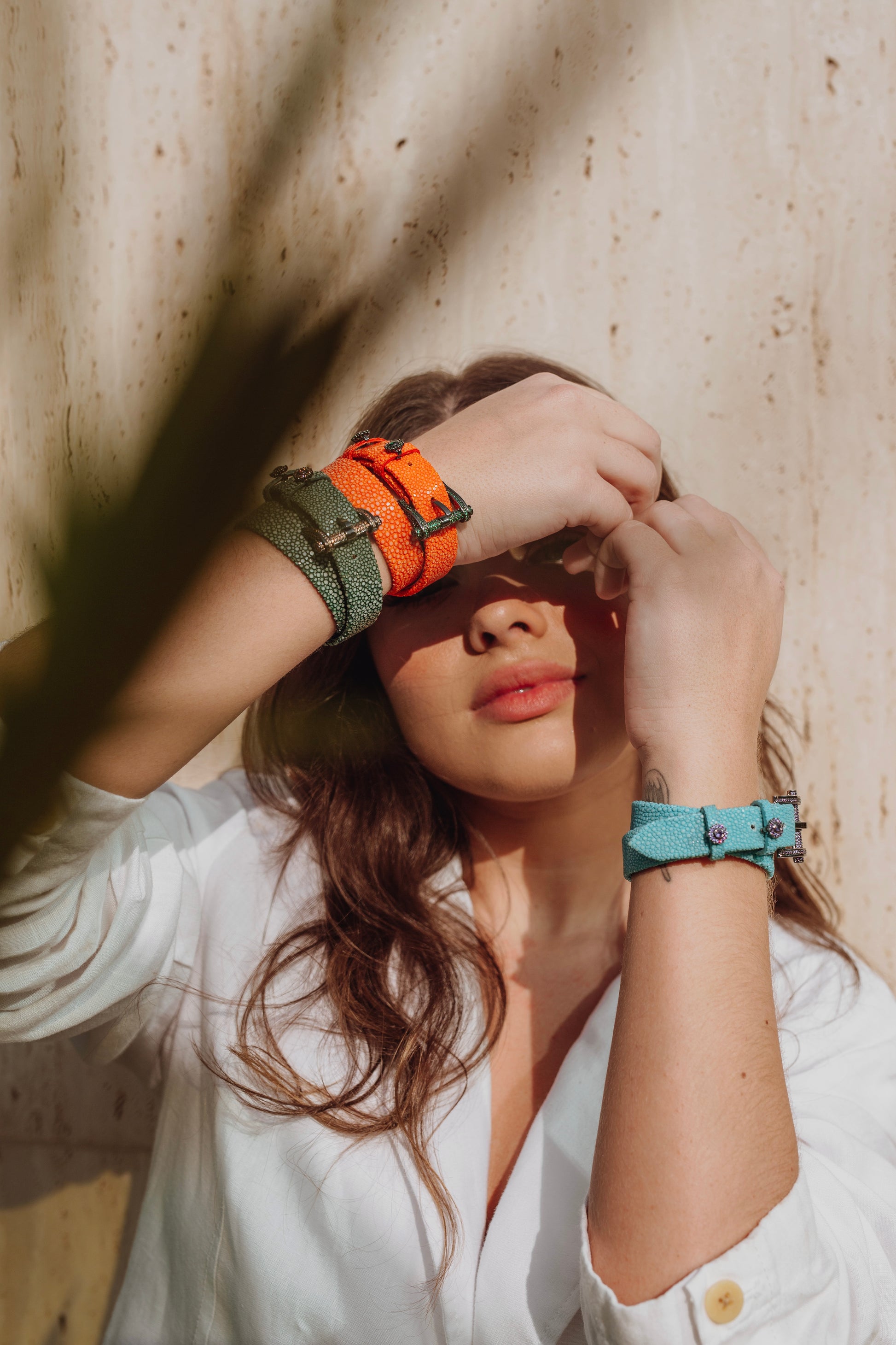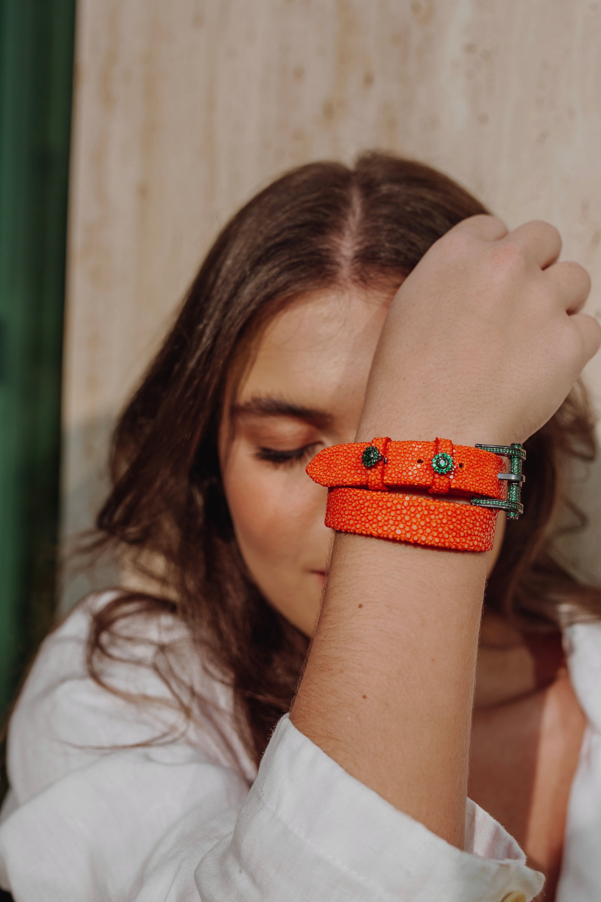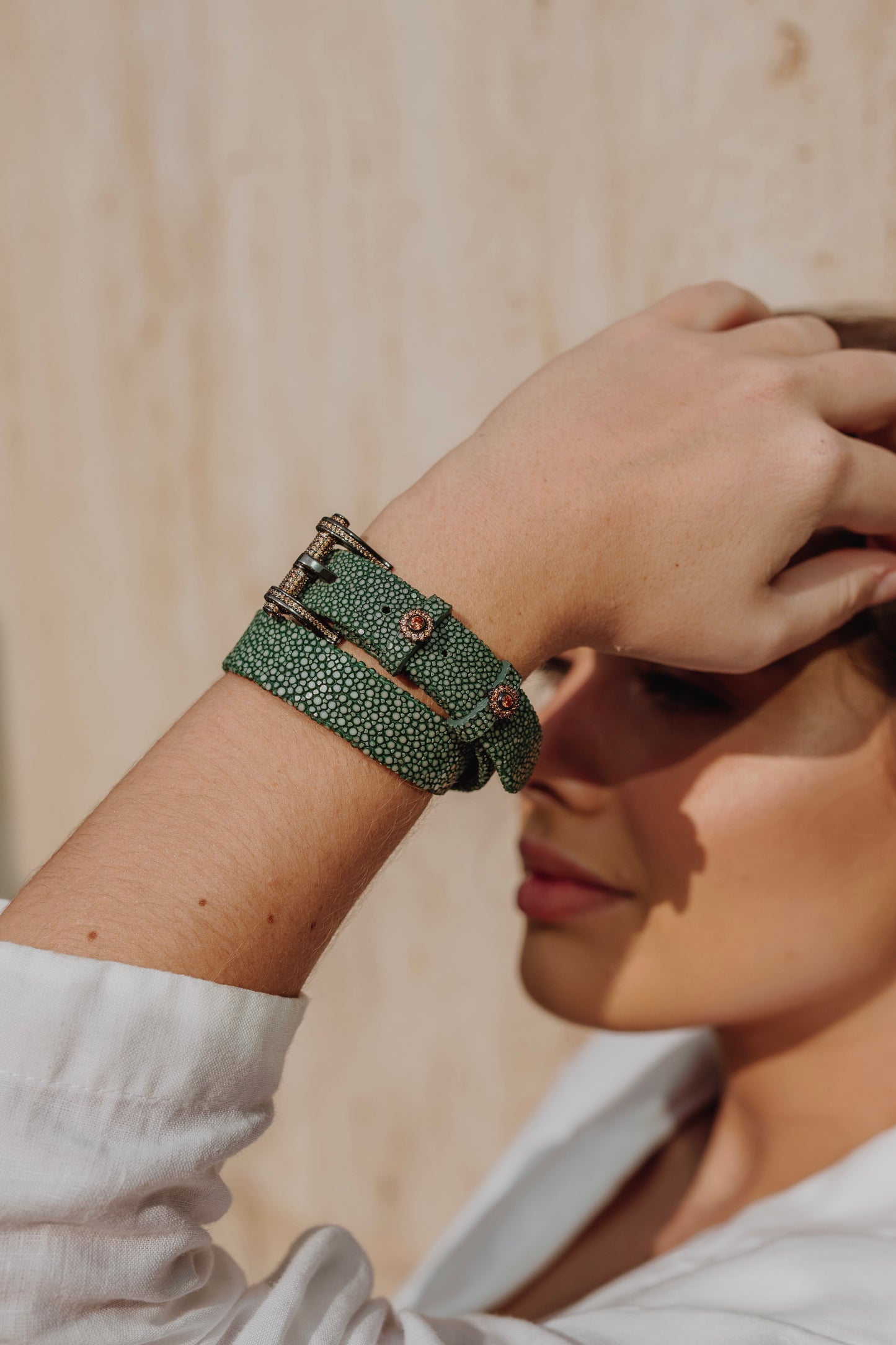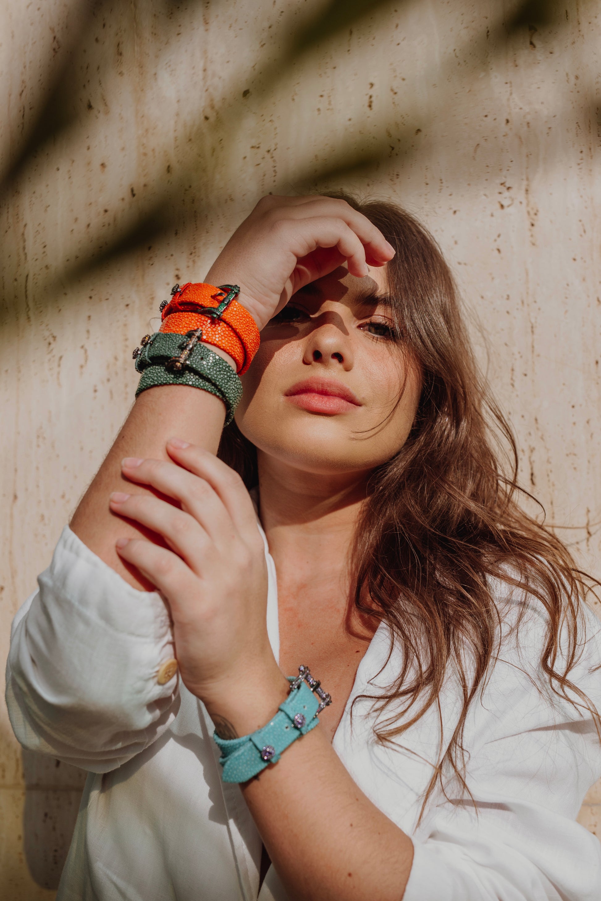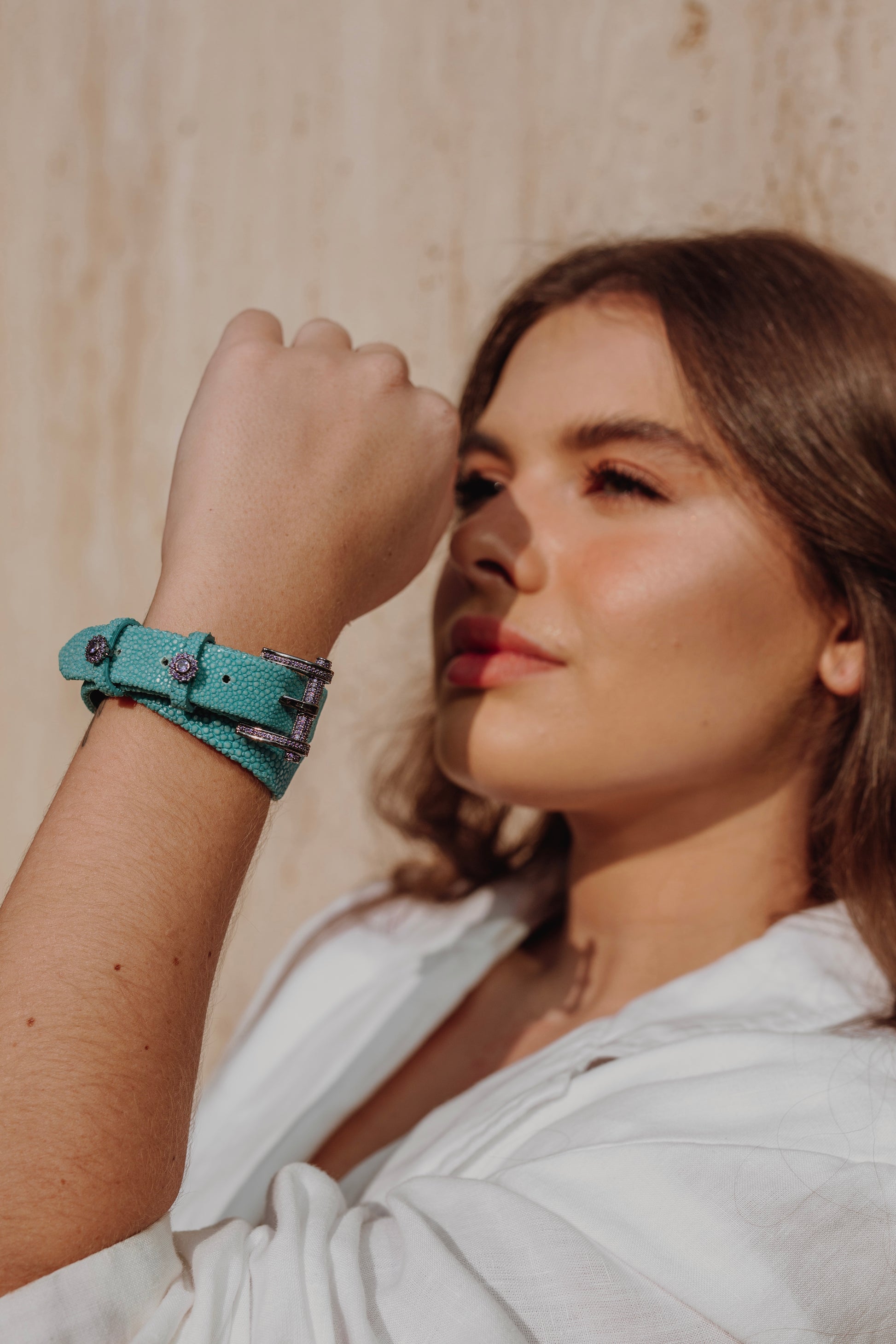Pulseira feita a mão no couro de arraia com pedras naturais.